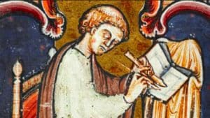 At daybreak on Wednesday he told us to finish the writing we had begun. We worked until nine o’clock, when we went in procession with the relics as the custom of the day required. But one of our community, a boy named Wilbert, stayed with him and said to him, “Dear master, there is still one more chapter to finish in that book you were dictating. Do you think it would be too hard for you to answer any more questions?” Bede replied: “Not at all; it will be easy. Take up your pen and ink, and write quickly,” and he did so.